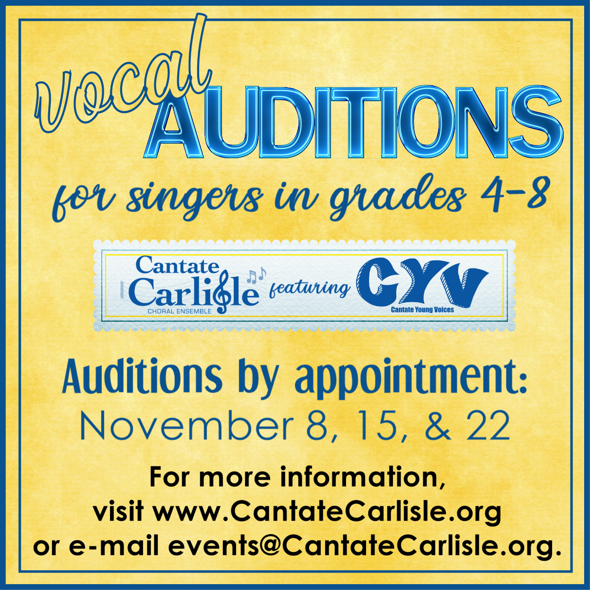 Whether you like singing in the rain, belting out the classics in the car, or participating in your school or church choir, you could be among the next group of Cantate Young Voices (CYV) singers to take the stage with Cantate Carlisle.